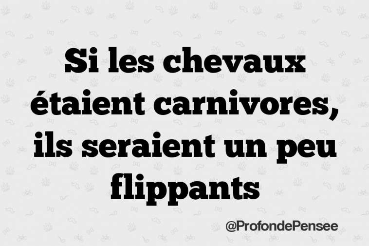 Pensées profondes Si les chevaux étaient carnivores, ils seraient un peu flippants 42 Views Cliquer pour envoyer un lien par e-mail à un ami(ouvre dans une nouvelle fenêtre) E-mail See more Previous article Il y a un millier d’années que les livres ont remplacé les tablettes Next article Il n’y aura plus jamais de gens plus âgés que moi qu’à cet instant précis Laisser un commentaire Annuler la réponseVotre adresse e-mail ne sera pas publiée. Les champs obligatoires sont indiqués avec *Commentaire * Nom * E-mail * Site web Prévenez-moi de tous les nouveaux commentaires par e-mail. Prévenez-moi de tous les nouveaux articles par e-mail. Δ