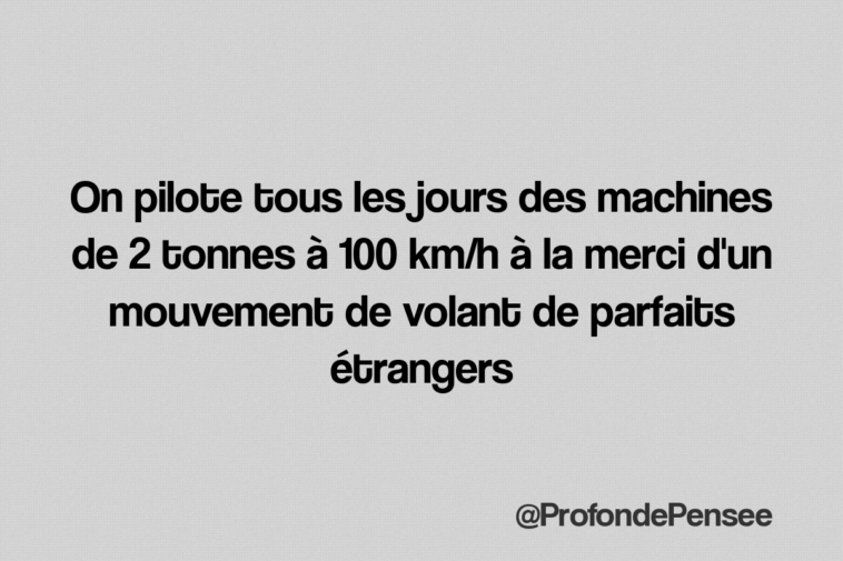 Pensées profondes On pilote tous les jours des machines de 2 tonnes à 100 km/h à la merci d’un mouvement de volant de parfaits étrangers Cliquer pour envoyer un lien par e-mail à un ami(ouvre dans une nouvelle fenêtre) E-mail See more Previous article Haine aléatoire injustifiée : les gens qui roulent pile à la vitesse limite