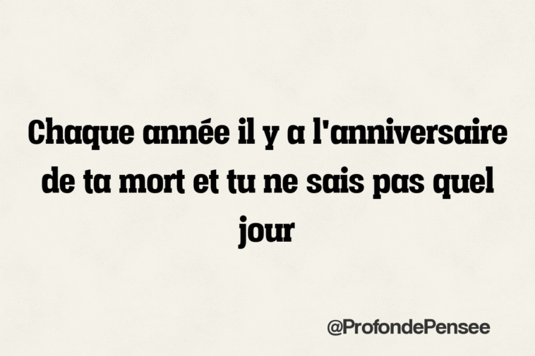 Pensées profondes Chaque année il y a l’anniversaire de ta mort et tu ne sais pas quel jour 17 Views Cliquer pour envoyer un lien par e-mail à un ami(ouvre dans une nouvelle fenêtre) E-mail See more Previous article Prendre sa voiture, c’est faire confiance à des centaines de gens Next article La chance qu’on a que les poules ne soit pas des animaux nocturnes