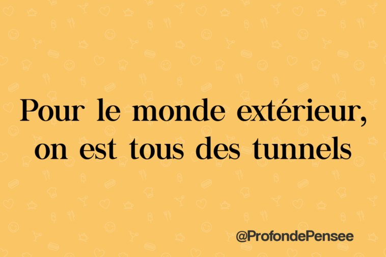 Pensées profondes Pour le monde extérieur, on est tous des tunnels 13 Views Cliquer pour envoyer un lien par e-mail à un ami(ouvre dans une nouvelle fenêtre) E-mail See more Previous article Un humain sort d’un humain car un humain est entré dans un humain