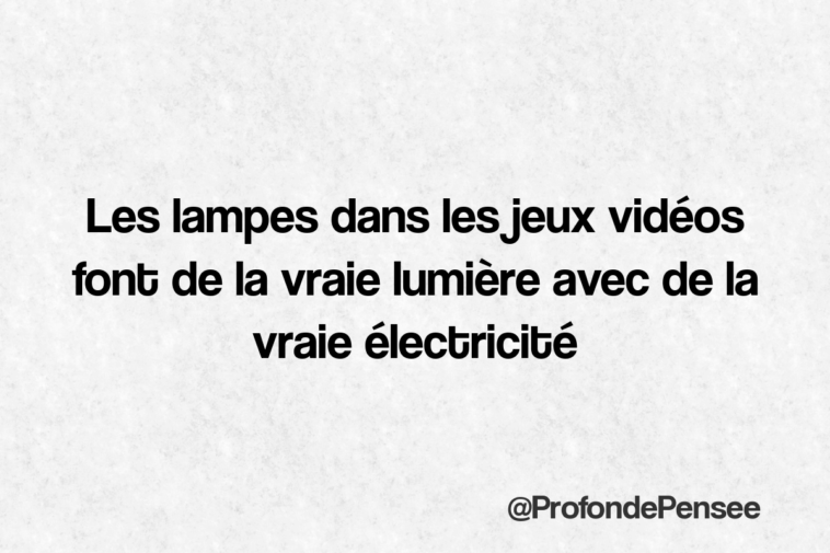 Pensées profondes Les lampes dans les jeux vidéos font de la vraie lumière avec de la vraie électricité Cliquer pour envoyer un lien par e-mail à un ami(ouvre dans une nouvelle fenêtre) E-mail See more Previous article L’âge adulte est beaucoup moins amusant que ce qu’on espérait enfant.